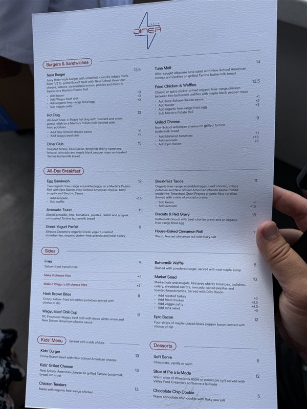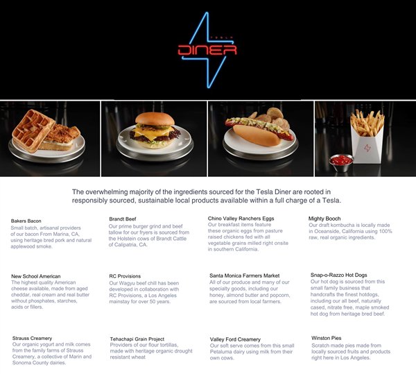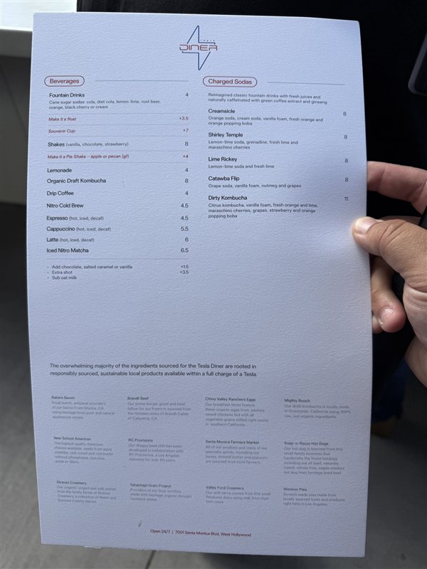 热狗为13美元/个、开业当天,儿童汉堡13美元、特斯拉全球首家超级充电站餐厅(Tesla Diner)正式开业,金枪鱼沙拉14美元、两块45英尺的屏幕,全天早餐鸡蛋三明治12美元、特斯拉餐厅食材全部都是有机视频,