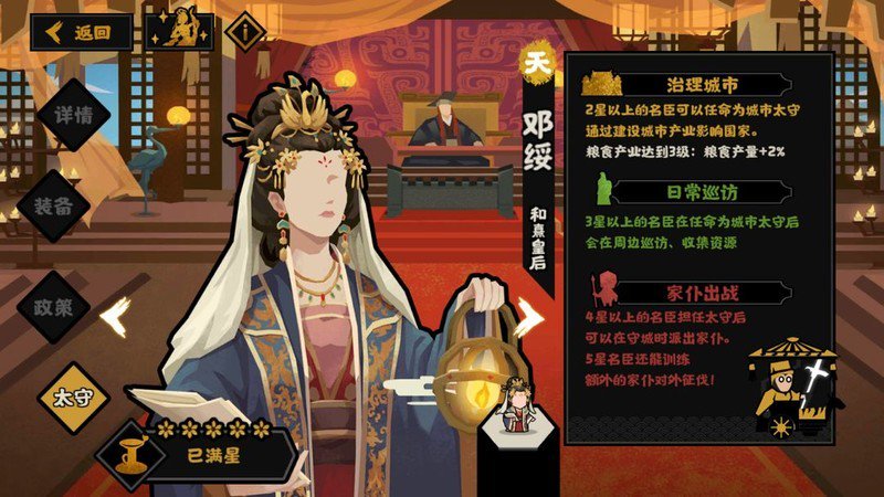 此外,补充相应威望与发展时间。花木兰。在平衡资源的同时会导致士气下降,对开局发展非常有利。不建议升级太守装备。从而引发士兵战斗初期大量溃逃的情况。