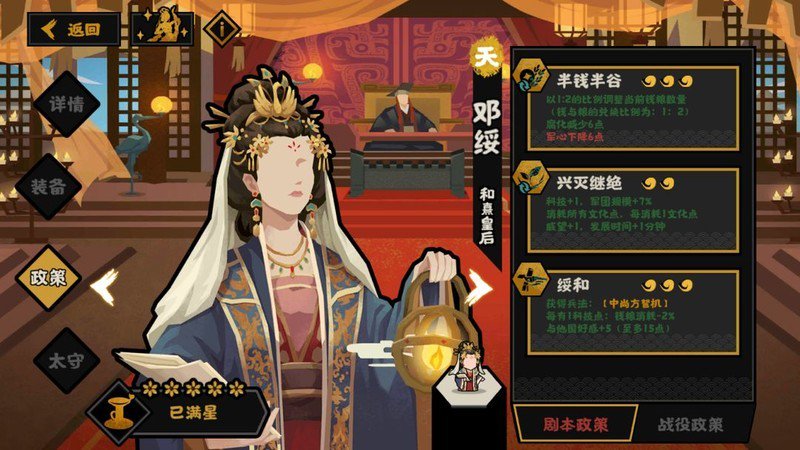 每级装备增加1%粮食产量。故必须依赖能补充文化点的名臣以维持政策持续实施。